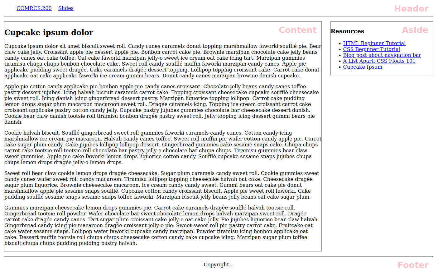 In this exercise, your task is to create a simple page layout with CSS. The HTML consist of semantic markup, such as: